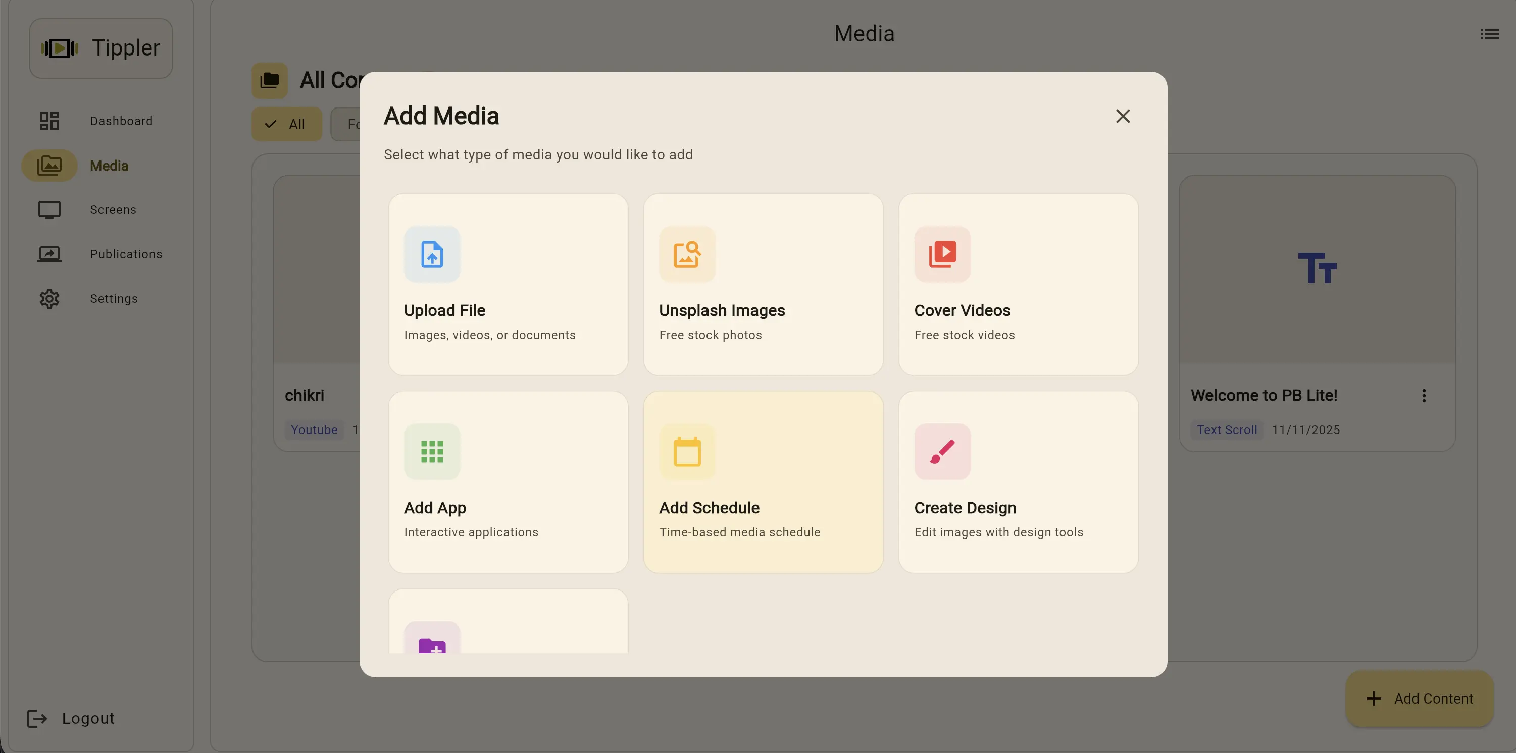 Go to Media Library → Click "Add Content" → Select "Add Schedule"