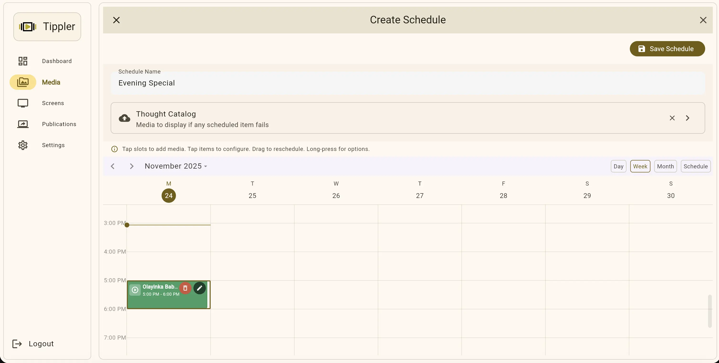 Add Item: Click "+" → Select Media → Set Time & Days → Save