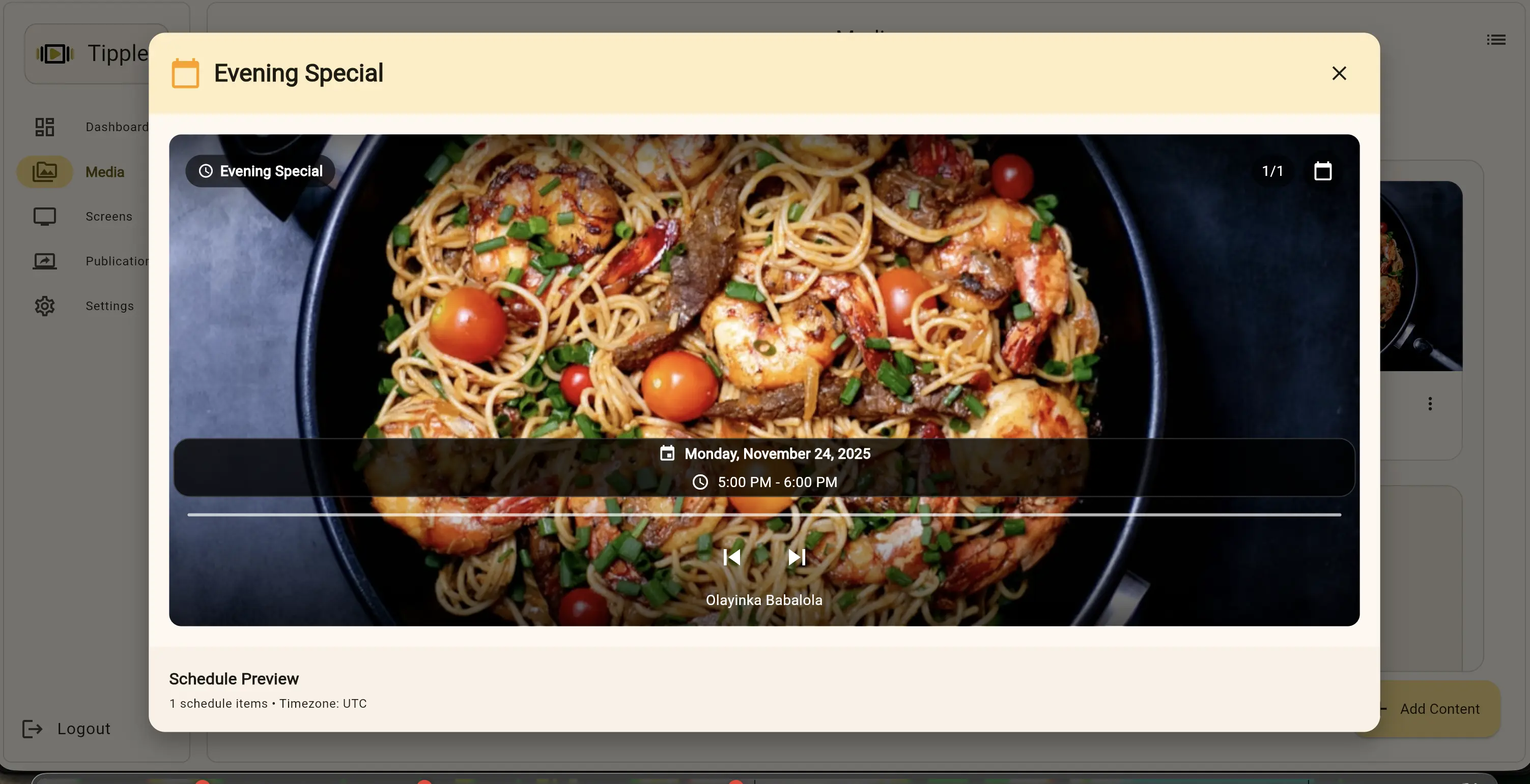 A Schedule App automatically shows different media at different times. Perfect for restaurant menus, daily announcements, or time-based promotions.